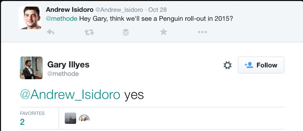 Have a look at this following confirmation conversation with Gary Illyes about Google’s Penguin expected roll-out date.